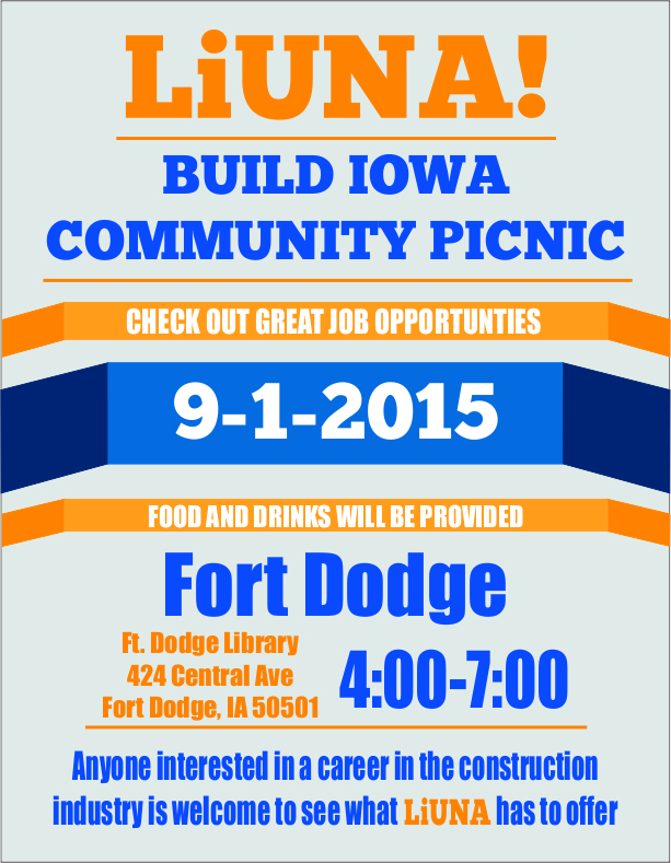 « All Events This event has passed. November 24 @ 9:04 am Ottumwa – Build Iowa Community Picnic (08/25/2015) » « All Events This event has passed. Fort Dodge; We Build Iowa Community Picnic September 1, 2015 @ 4:00 pm - 7:00 pm Free « Ottumwa – Build Iowa Community Picnic (08/25/2015) Ottumwa – Build Iowa Community Picnic (08/25/2015) » + Google Calendar+ iCal Export Details Date: September 1, 2015 Time: 4:00 pm - 7:00 pm Cost: Free Event Category: Community Event Event Tags:Community Event, Community Picnic, Construction, Construction Jobs, Job Fair, LIUNA, Union, We Build Iowa Website: webuildiowa.org Organizer LIUNA (Laborers’ International Union of N.A.) Website: www.liuna.org Venue Fort Dodge Library 424 Central Ave Fort Dodge, IA 50501 United States + Google Map Website: www.webuildiowa.org + Google Calendar+ iCal Export Details Date: September 1, 2015 Time: 4:00 pm - 7:00 pm Cost: Free Event Category: Community Event Event Tags:Community Event, Community Picnic, Construction, Construction Jobs, Job Fair, LIUNA, Union, We Build Iowa Website: webuildiowa.org Organizer LIUNA (Laborers’ International Union of N.A.) Website: www.liuna.org Venue Fort Dodge Library 424 Central Ave Fort Dodge, IA 50501 United States + Google Map Website: www.webuildiowa.org